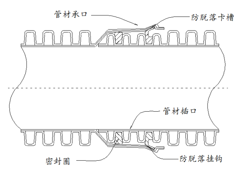 卡槽式防脱落橡胶圈密封承插连接,由带防脱落卡槽的管材承口、管材插口、密封圈、防脱落挂钩组成