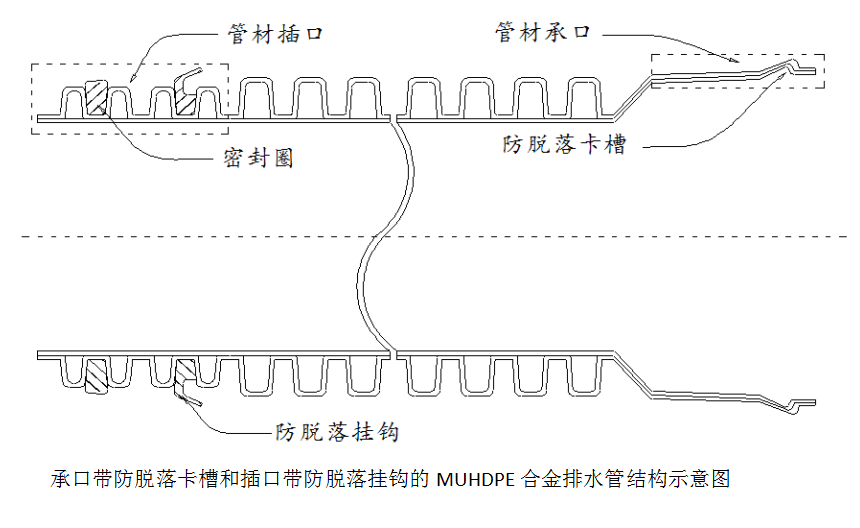 4.MUHDPE合金管采用防脱落式橡胶圈密封承插连接:安装施工方便,施工效率高,同时, 防脱落接头具有良好的抗沉降性,可确保管材在一定地质沉降情况下,不脱落、不泄露,具体有如下优点: